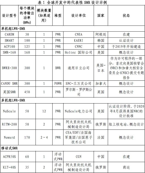 目前,至少有72個SMR概念正處于不同的開發階段(IAEA,2020年),較2018年增加了40%(IAEA,2018年)。表1列舉了國際上處于開發階段的代表性SMR,其中大約一半的設計概念基于LWR技術,另一半基于第四代概念。雖然“SMR”一詞在世界各地被用來指所有小型反應堆設計,但主要類型的SMR之間仍存在顯著差異,特別是在設計模塊化程度方面。