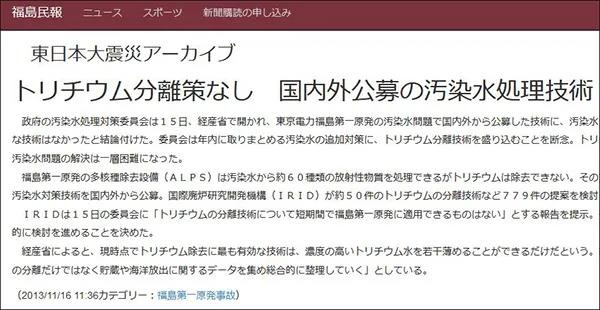 日本《福島民報》早在2013年11月時就報道稱,日本政府“污染水處理對策委員會”當初在處理核廢水時,就曾探討如何過濾氚,并且在當年10月面向全球征集包括“氚分離”技術在內的“核廢水處理方案”。