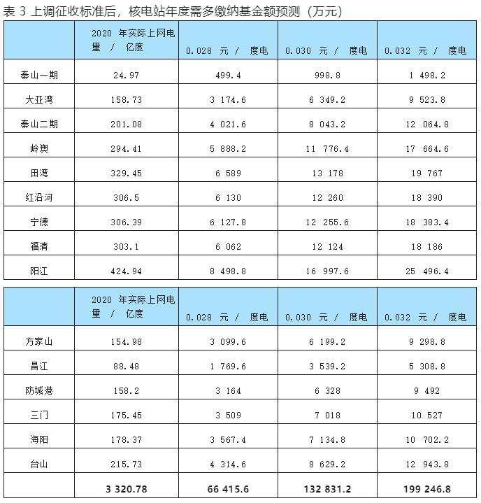 將征收標準從現行的 0.026 元 / 度電分別提高到 0.028 元 / 度電、0.030 元 /度電和 0.032 元 / 度電,以 2020 年實際上網電量為例,預測壓水堆核電站年度需多繳納的基金額(見表 3)。