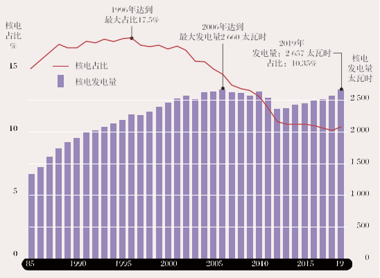 圖 1 1990 年至 2019 年核電發電量及占比情況