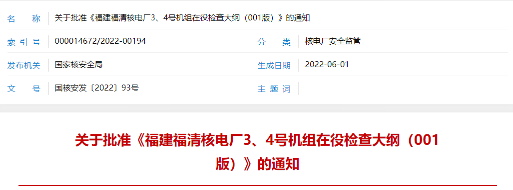 根據(jù)《中華人民共和國核安全法》《中華人民共和國民用核設施安全監(jiān)督管理條例》的有關要求,我局對你公司提交的申請文件進行了技術審評,認為你公司《福建福清核電廠3、4號機組在役檢查大綱(001版)》是可以接受的,現(xiàn)予批準。