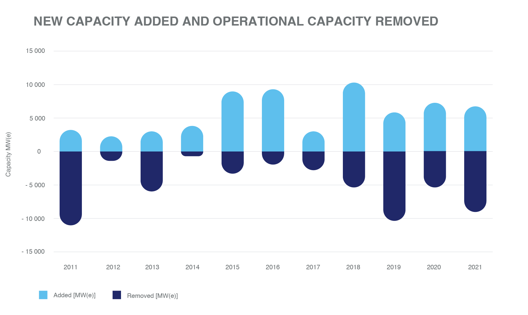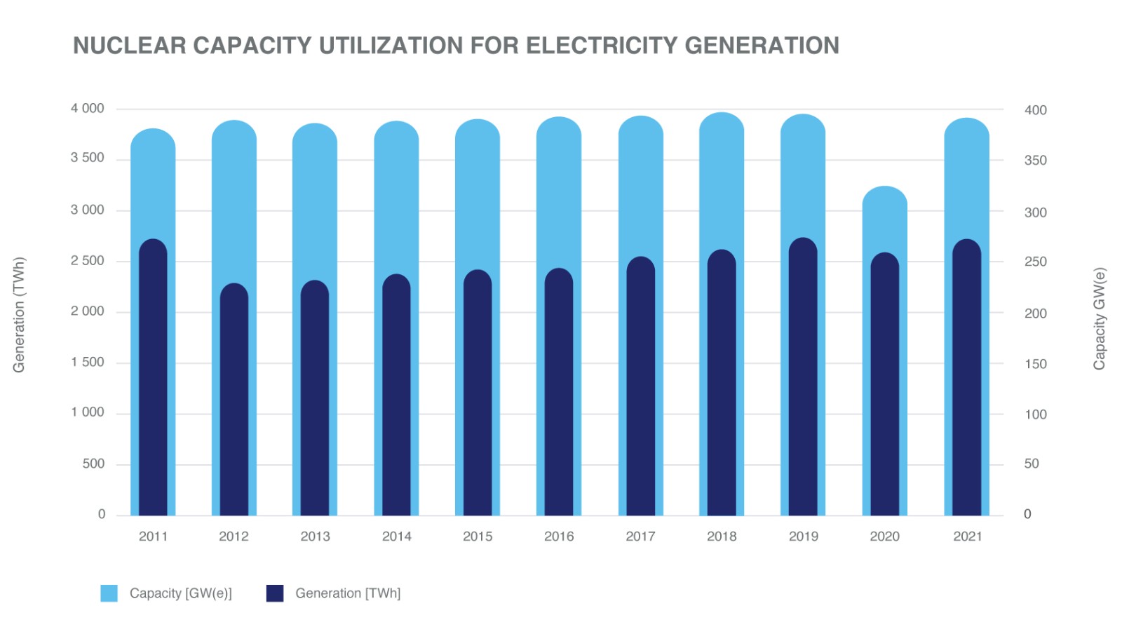 2021年,雖然全球總容量比2020年減少了約3千兆瓦(e)或1%,但發電量卻增加了4%。在這一年里,447個核電反應堆的總運行核電能力中的397.6吉瓦(e)被用來發電,為2021年的統計和分析做出了貢獻。