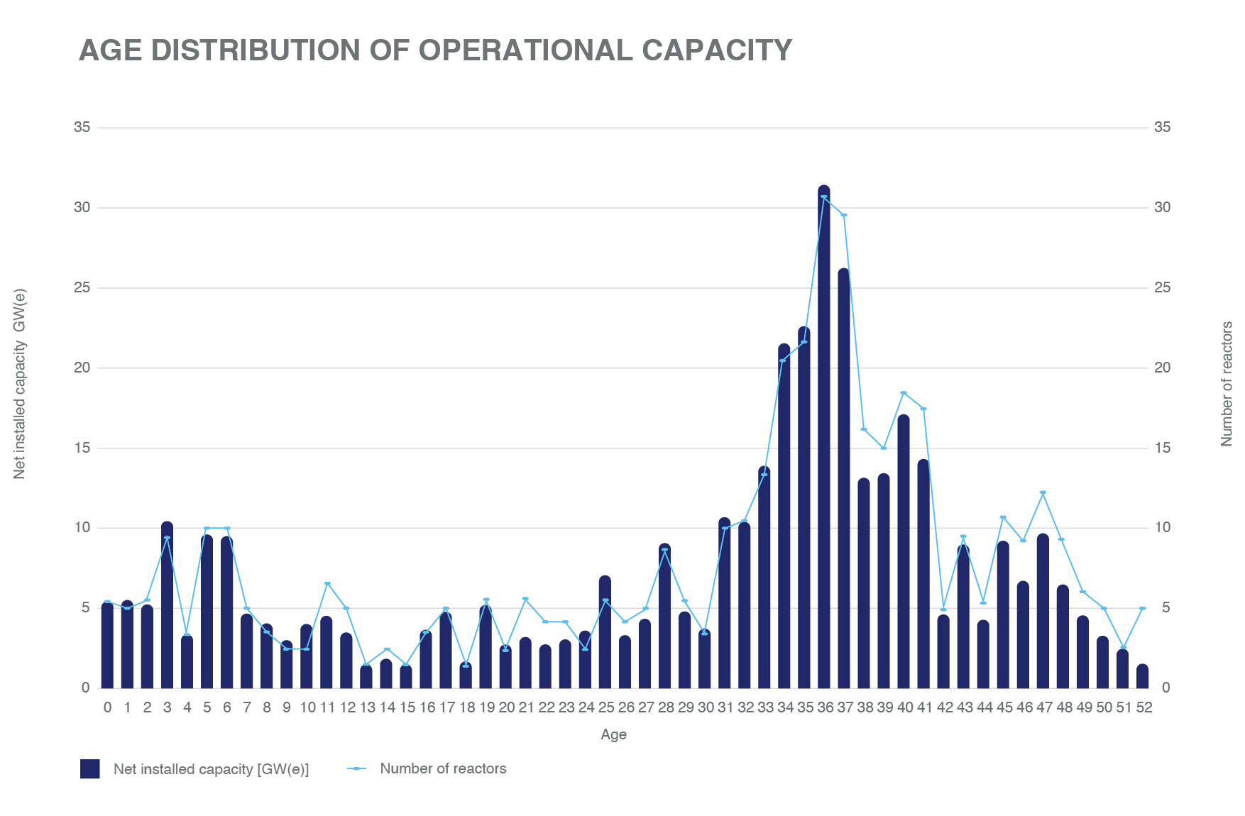 大約66%的運行反應堆總容量(257 GW(e),289個反應堆)已經運行了30多年。超過23%的全球運行核電容量(91.2 GW(e),117個反應堆)已經運行超過40年,而1.9%的可用容量(7.3 GW(e),13個反應堆)已經運行超過50年。老化的機組凸顯了對新的或升級的核電能力的需求,以抵消計劃中的退休,并為可持續性和全球能源安全及氣候變化目標作出貢獻。公用事業單位、政府和其他利益相關者正在為越來越多的反應堆的長期運行和老化管理計劃進行投資,以確保可持續運行和向新產能的平穩過渡。