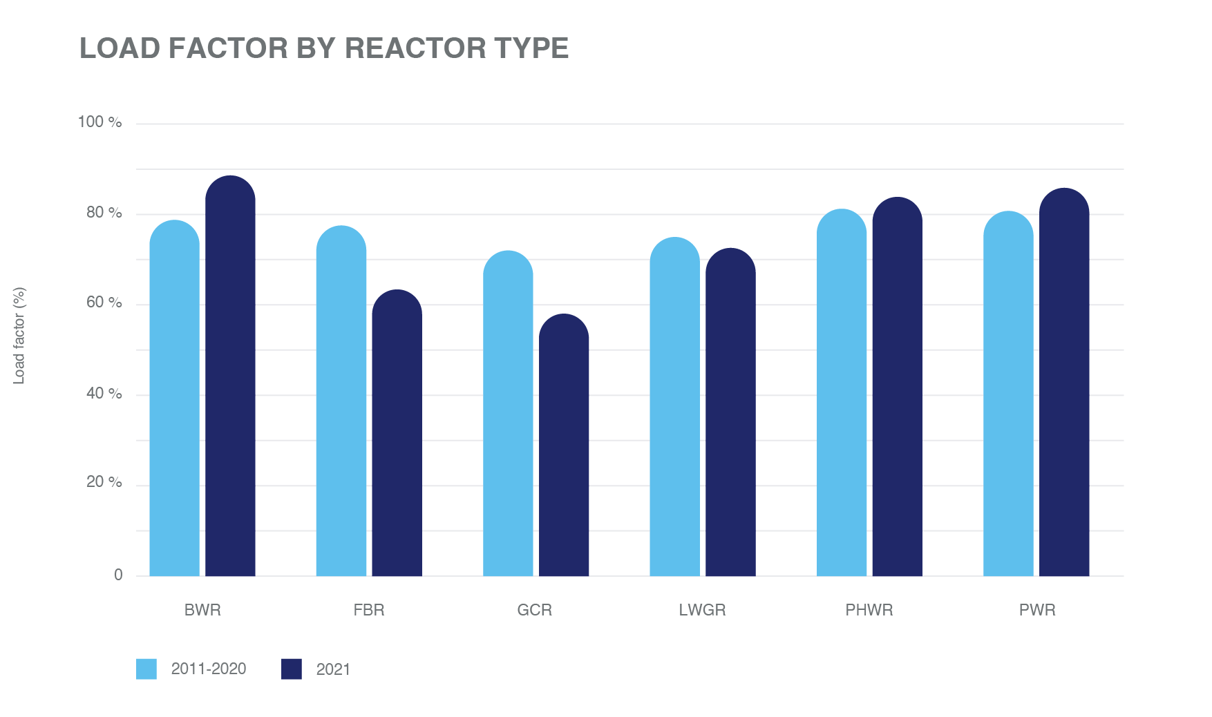 機組性能。 即使機組老化,運行中的核電反應堆繼續表現出高水平的整體可靠性和性能。負荷率,也被稱為容量系數,是指一個反應堆的實際能量輸出除以如果它全年以額定功率輸出(參考單位功率)運行所產生的能量輸出。負荷率或容量系數表示良好的運行性能。2021年,全球容量因子的中位數為85.6%,與最近幾年一致。自2011年以來,壓水反應堆(PWR)和加壓重水慢化和冷卻反應堆(PHWR)一直是表現最好的反應堆,容量系數中值分別為82%和81%。