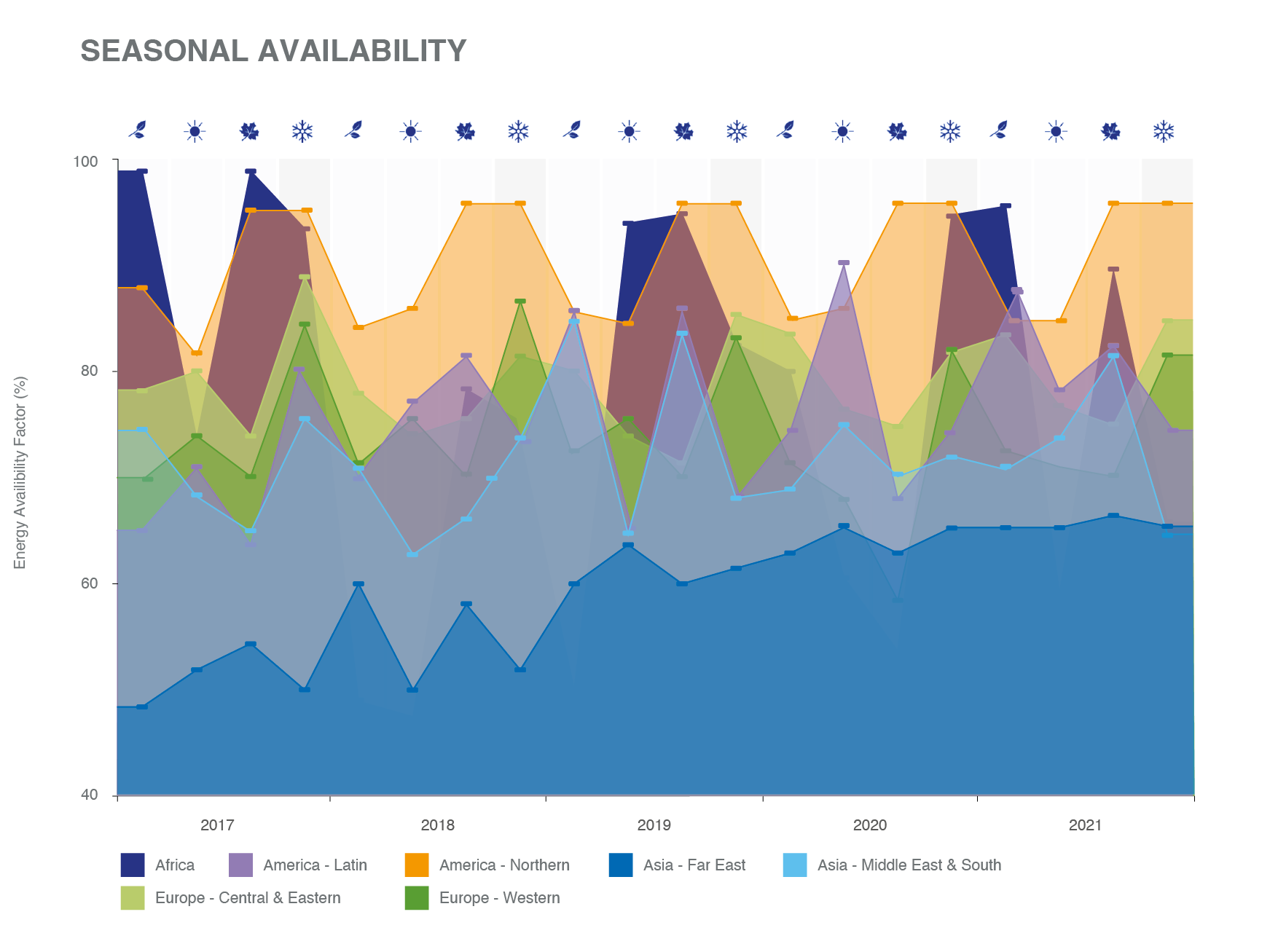 衡量核反應堆性能的另一個指標是能源可用系數(EAF),它指的是可用能力在特定時間段內可能產生的能量與參考單位功率可能產生的能量的比率。2021年,加權平均EAF為77.6%,其中半數核反應堆的EAF也在86%以上運行。核電站運營商通常在低需求季節安排加油和維修停運,以便在高需求季節最大限度地提高能源利用率。