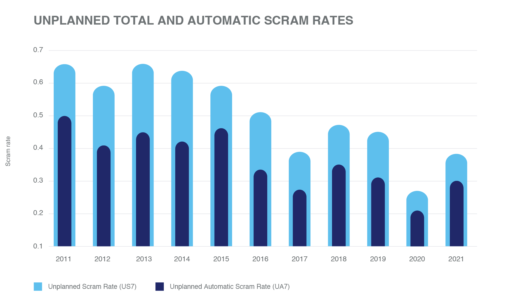 數據顯示,核電反應堆的可靠性和安全性保持在一個較高的水平。上圖顯示,自2003年以來,每臺機組每運行7000小時(約一年)發生的非計劃手動(UM7)和自動擦傷(UA7)逐漸減少。非計劃性擦傷數量的減少歸功于持續改進電廠運行和維護管理的歷史。