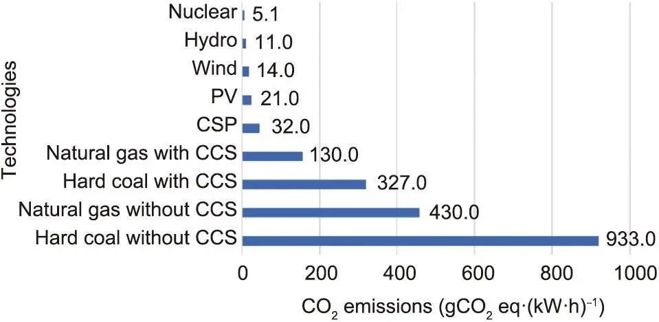圖4 不同發電技術全生命周期CO2當量排放量。按中值遞增排列[gCO2eq?kWh-1,即每千瓦時的CO2當量排放量克數]。經許可轉載自參考文獻。CCS:碳捕獲和封存;CSP:聚光太陽能發電。