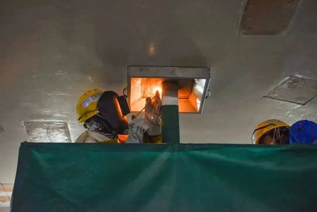 2023年5月15日7時38分,海南昌江核電廠4號機組核島反應堆廠房內殼鋼襯里模塊五吊裝就位,歷時2時10分,整體吊裝過程安全、可控,此次吊裝成功標志著4號機組鋼襯里筒壁模塊化施工順利完成,為后續內穹頂施工創造了有利條件。