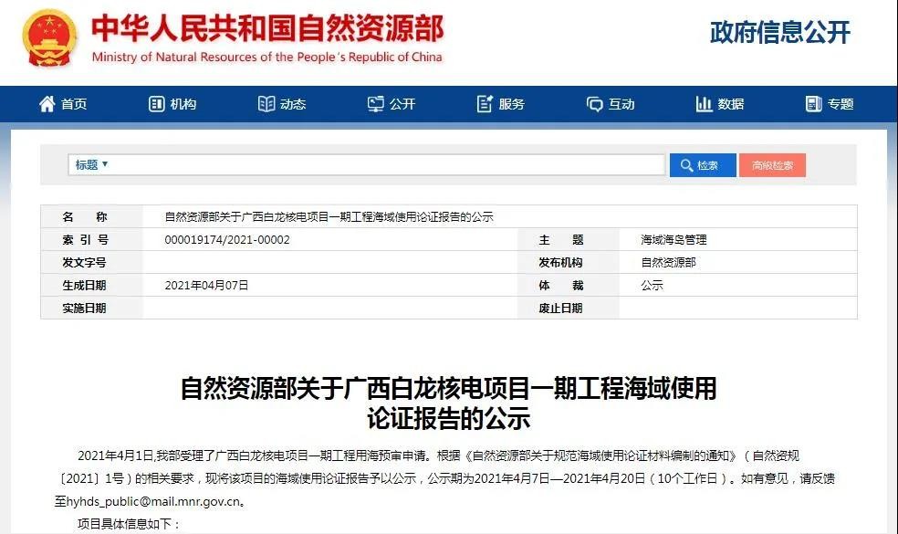 自然資源部發布關于廣西白龍核電項目一期工程海域使用論證報告的公示